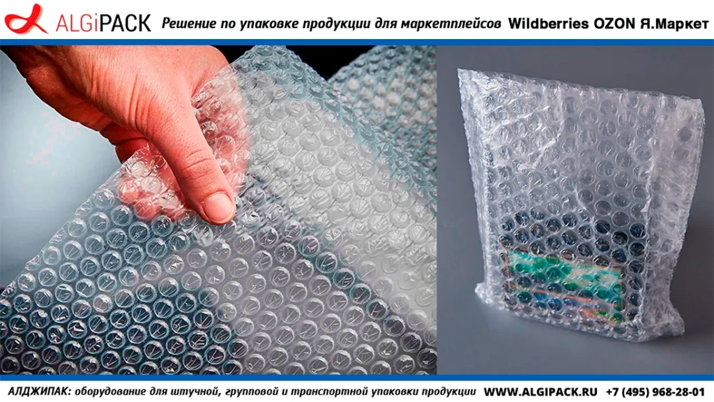 Полиэтиленовая пленка обладает отличными прочностными характеристиками и высокой стойкостью к внешним механическим воздействиям. Она имеет широкую вариативность по внешнему виду: от полупрозрачной до полностью окрашенной; а также хорошо подходит для нанесения печати и в таком виде может служить дополнительной площадью для размещения справочной или рекламной информации о продукте, его производителе или отправителе. Для транспортной упаковки продукции используются полиэтиленовая пленка толщиной от 40 до 100 микрон. Для целей маркетплейсов этот вид материала используется в двух вариантах упаковки, а именно: упаковка в так называемый «свободный пакет», то есть упаковка с запайкой продукции по периметру изделия, или термоусадочная упаковка, то есть запайка продукции в пакет с последующей усадкой пленки в термотоннеле. Способ подбирается в каждом индивидуальном случае с учетом задачи упаковки и характеристик продукции.